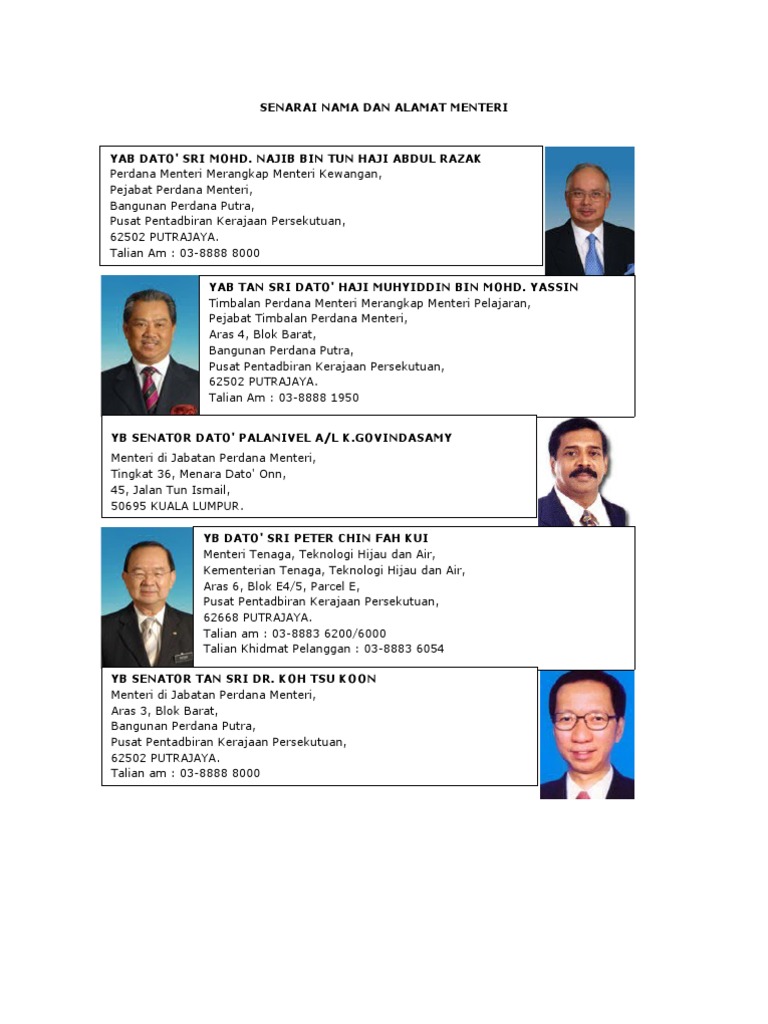 Lampiran Senarai Alamat Kementerian 2 3 4 5 6 8 9 Jabatan Perdana Menteri Blok Utama Bangunan Perdana Pdf Document from demo.vdokumen.net Osc diwujudkan untuk memudahkan pelanggan berurusan dengan bahagian pengurusan hartanah (bph), jabatan perdana menteri (jpm) yang meliputi urusan rumah. Singkatan jpm) merupakan sebuah kementerian kerajaan persekutuan di malaysia. Perdana menteri, bersama dengan menteri terpilih lainnya membentuk dewan menteri, yang seharusnya menjadi anggota parlemen. Jabatan perdana menteri (jpm) merupakan jabatan kerajaan yang menentukan pengurusan sumber manusia, kewangan, pembangunan, perakaunan dan khidmat pengurusan dilaksanakan mengikut dasar, perundangan/ peraturan dan garis panduan semasa. Basuki tjahaja purnama atau ahok kini memegang dua jabatan di pt pertamina (persero). Www.facebook.com/jab.perdanamenteri twitter hadir sama, yb datuk ahmad marzuk shaary, timbalan menteri di jabatan perdana menteri; Perkhidmatan kami menyediakan maklumat atau arahan yang tepat dan mudah difahami. Jabatan perdana menteri (prime minister's department) plays a very important role in the administration of malaysia.